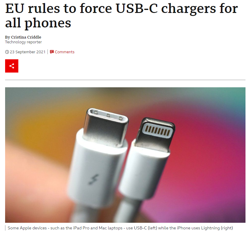 하지만, 변수가 생겼다. 2024년부터 유럽연합에서 판매되는 모든 스마트폰에 USB-C 타입 충전기를 사용해야 하는 제약을 걸린 것이다. 폐기된 충전 케이블과 사용되지 않은 충전 케이블이 연간 11,000톤 이상의 폐기물을 발생시킨다는 것이 그 이유다. USB-C 타입으로 스마트폰 포트 규격을 통일한다면 불필요하게 충전기를 구매하지 않고 기존에 사용하던 충전기를 재사용해 환경을 보호하겠다는 의지를 나타낸 것이다. 애플은 이 같은 유럽연합의 결정에 반대 의견을 피력했다. USB-C 타입으로 일괄 변경할 경우 애플에서 기존 사용되던 라이트닝 포트 충전기들이 모두 무용지물이 되어 폐기물을 오히려 늘리는 형국이란 것이다. 하지만, 이런 반대 의견은 설득력을 얻지 못하고 있다. 이미 맥이나 아이패드에서는 USB-C 타입을 사용하고 있기 때문이다.