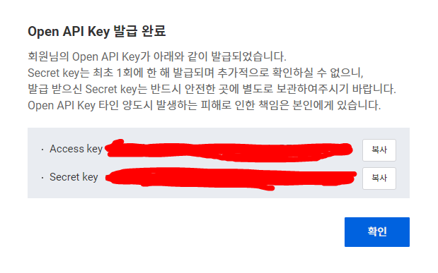 두 번째 사진처럼 Open API Key 관리에 값이 나오면 OK