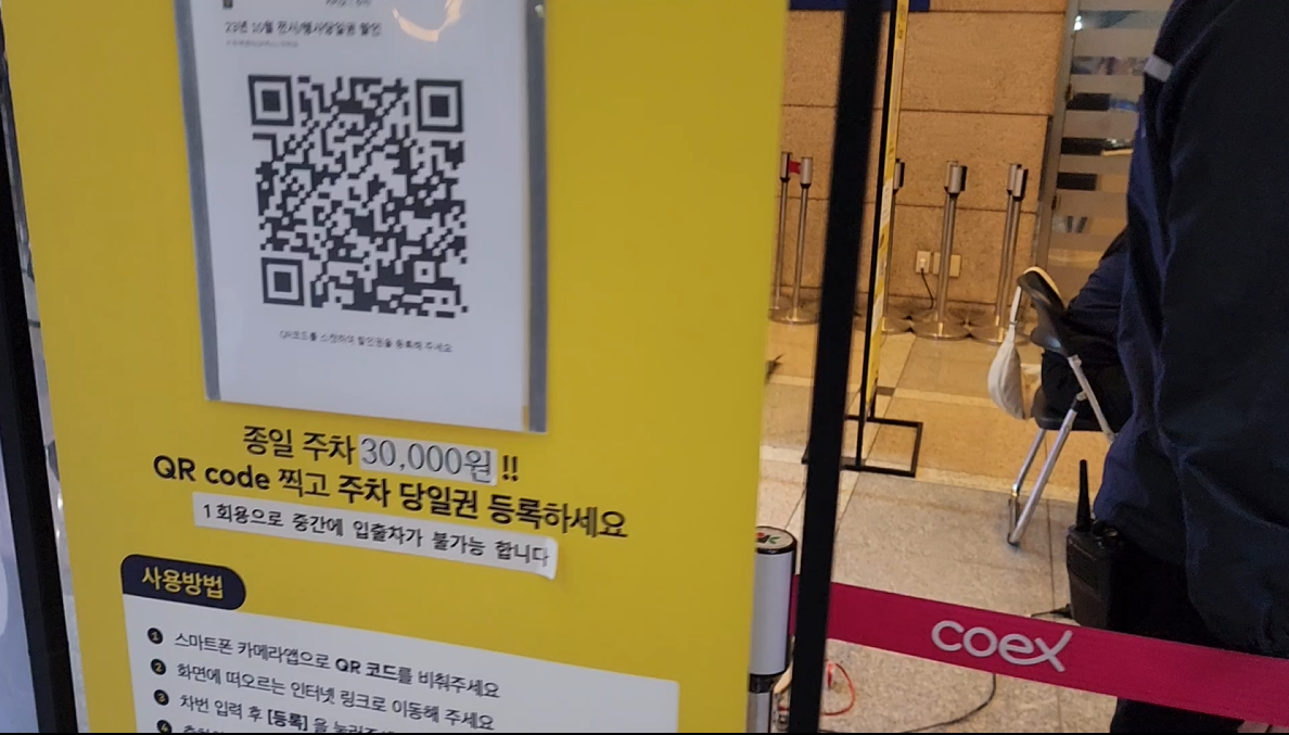 참관객은 주차 종일권이 48,000원으로 기억하는데, 행사장에서 QR code를 찍고 3만원으로 할인 받을 수 있었다.