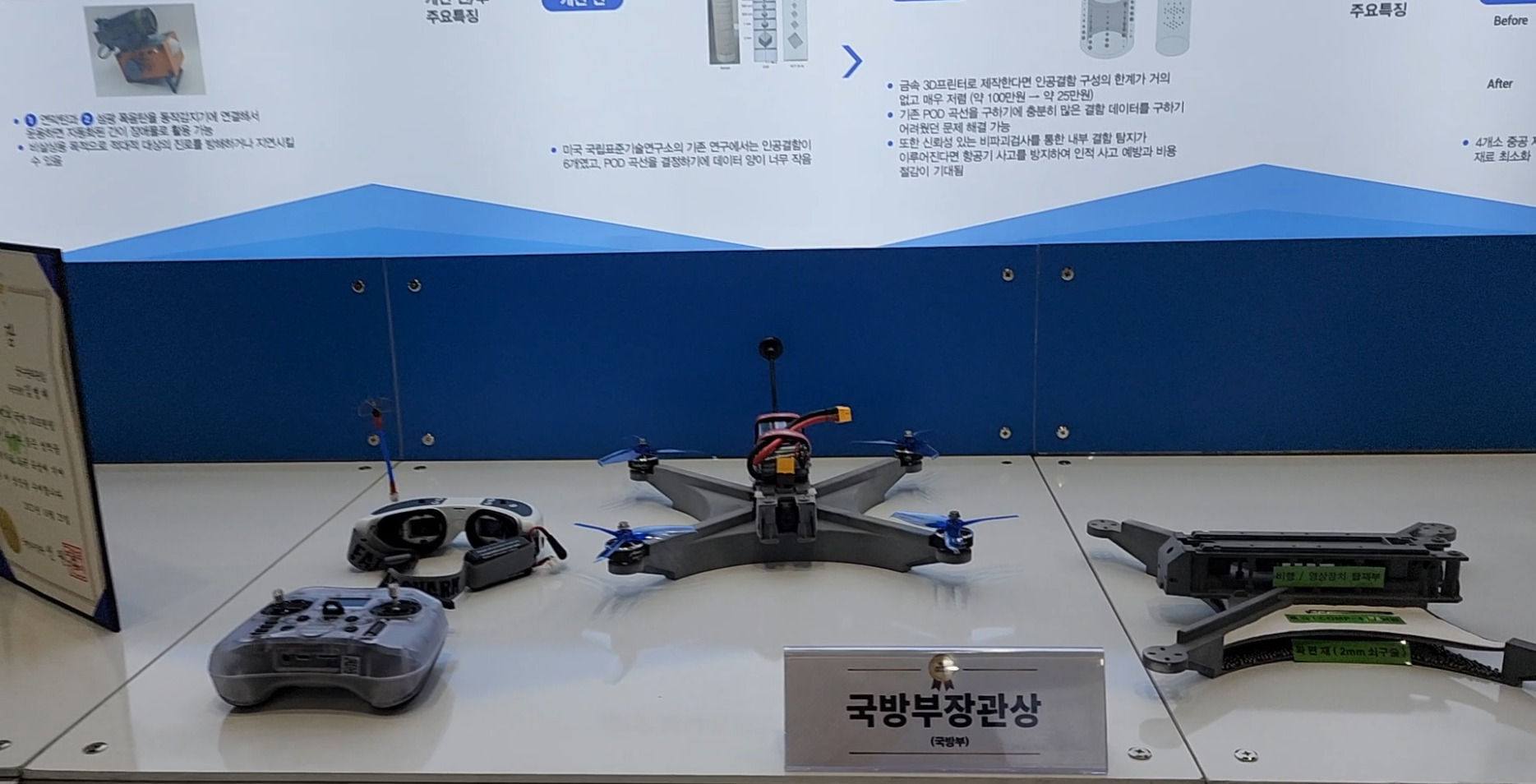 3D 프린팅 기술이 중요하다는 것을 한 부스에서 볼 수 있었다. 바로 국방부에서 주관한 '제 2회 국방 3D 프린팅 경진대회' 였다. 여기서 특히 눈여겨 본 것은 군용 드론이다. 최근 전쟁을 통해 드론의 역할을 잘 알 것이다. 이를 3D 프린팅으로 빠르게 뽑아낼 수 있다고 한다.