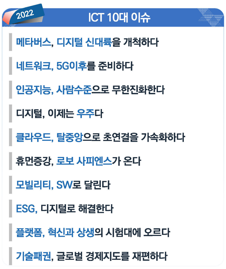 IITP(정보통신기획평가원)에서 발표한 <2022 ICT 10대 이슈> 내용과 주관적인 생각을 더해 작성하였습니다.