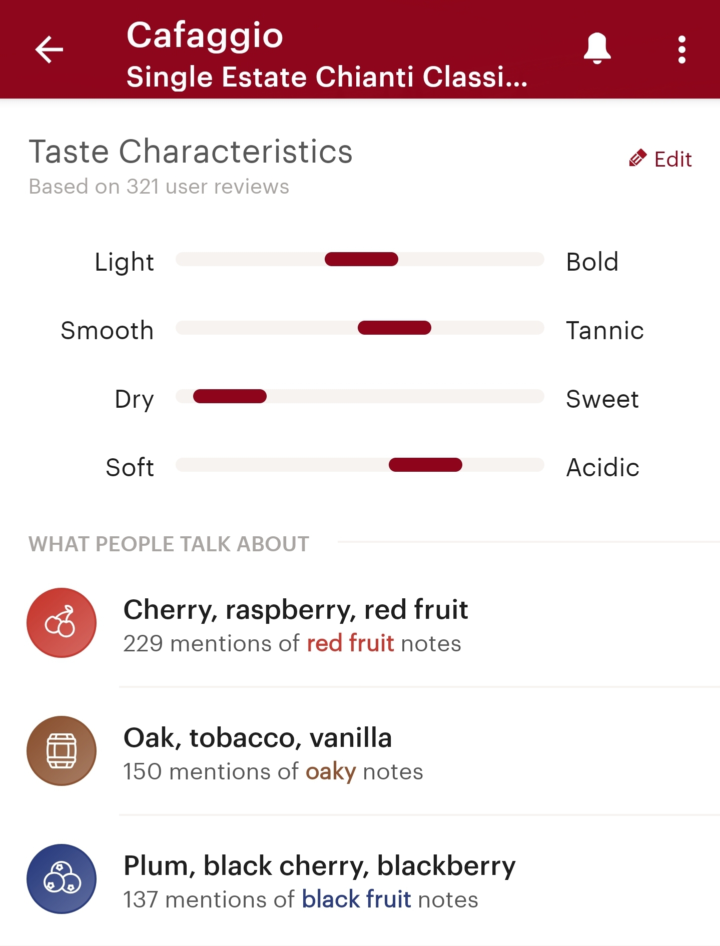 드라이하지만 부드러운 와인 산미는 보통 정도이고, 타닌 함량이 높은 것 같고