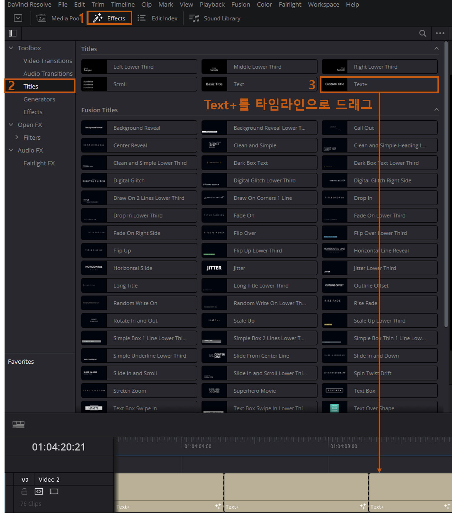 Effects → Titles → Text+를 드래그해서 Timeline으로 이동