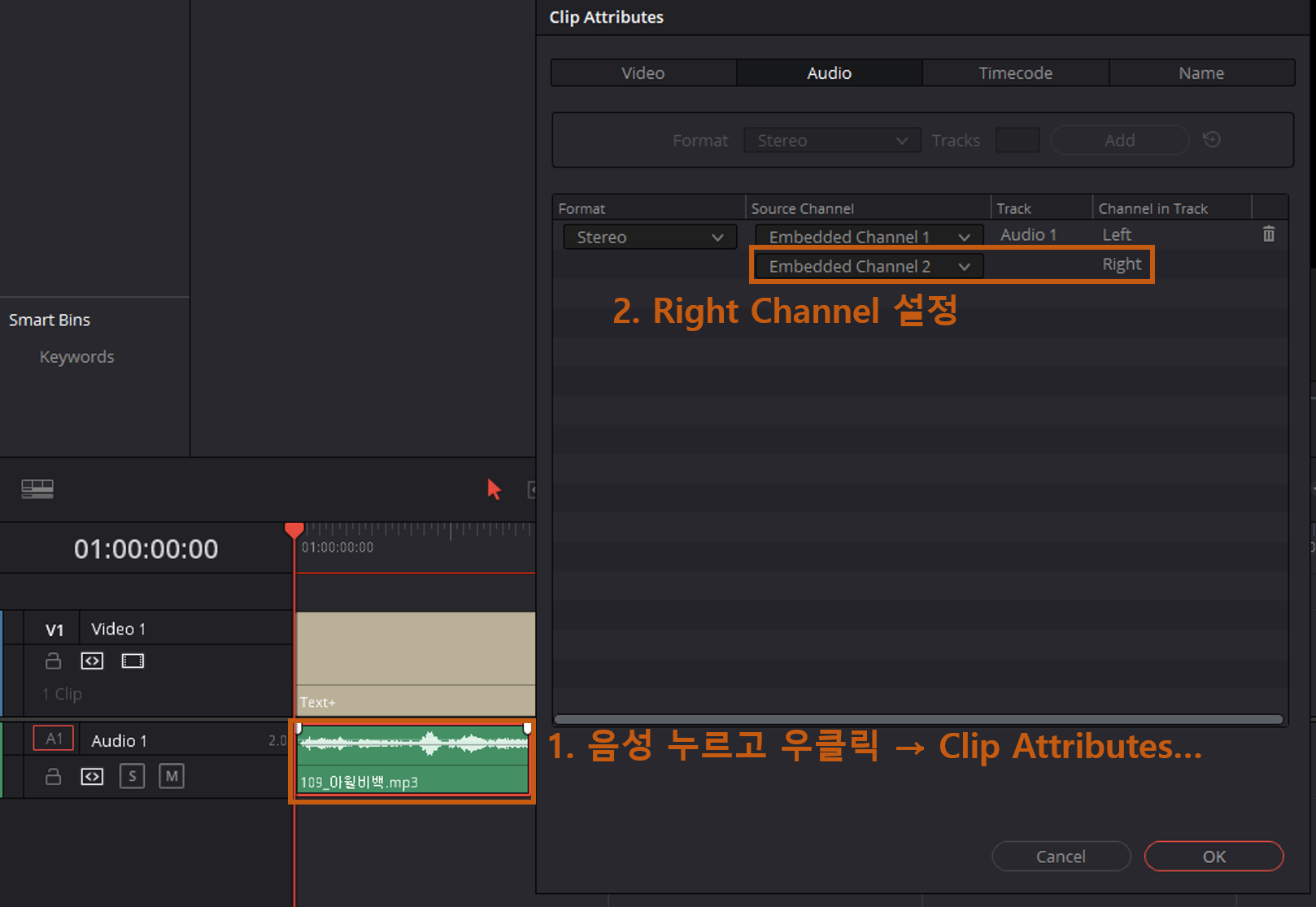 2. [Audio] Tab → Format Stereo 설정 및 Right 채널 Embedded Channel 설정